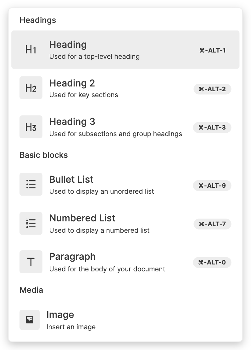 The Slash Menu is a Suggestion Menu that opens with the / character (or when clicking the + button in the Block Side Menu.